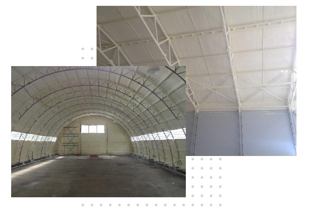 Хорошо известно, что в последние десятилетия подавляющее большинство строящихся в нашей стране арочных ангаров, складов являются быстровозводимыми конструкциями. Причем ангары могут использоваться в качестве торговой или торгово-складской точки, рынка, производственного цеха, автостоянки. Такое сооружение обходится недорого на этапе закупки и монтажа, а монтаж делается очень быстро. Долгим является и срок эксплуатации сооружения, что обеспечивается высокими эксплуатационными свойствами оцинкованной стали, профнастила. Но в климатических условиях России полнофункциональная эксплуатация таких сооружений оказывается практически невозможной без теплоизоляции. И именно утепление ангаров и складов ППУ выступает наилучшим вариантом решения вопроса! Лучшим метод оказывается в первую очередь потому, что теплоизоляционный слой очень легок, он практически не создает дополнительной нагрузки на конструкцию. Высокие адгезийные характеристики пенополиуретана позволяют быстро и успешно напылять его на разного рода конструктивные элементы, стены, потолок, обеспечивать равномерный утепляющий слой без использования креплений, возникновения «мостиков холода». ППУ имеет низкую водо- и паропроницаемость, а отсутствие между слоем теплоизоляции и строительной поверхностью зазора исключает появление конденсата.