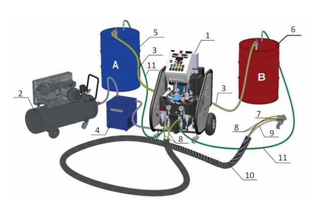 1. Установка высокого давления 2. Компрессор воздушный 3. Рукава заборные 4. Осушитель воздуха 5. Бочка компонента А 6. Бочка компонента В 7. Пистолет-распылитель 8. РВД подачи компонентов из дозатора в пистолет-распылитель 9. Шланг подачи воздуха в пистолет-распылитель 10. Подогреваемые РВД в связке 11. РВД рециркуляции.