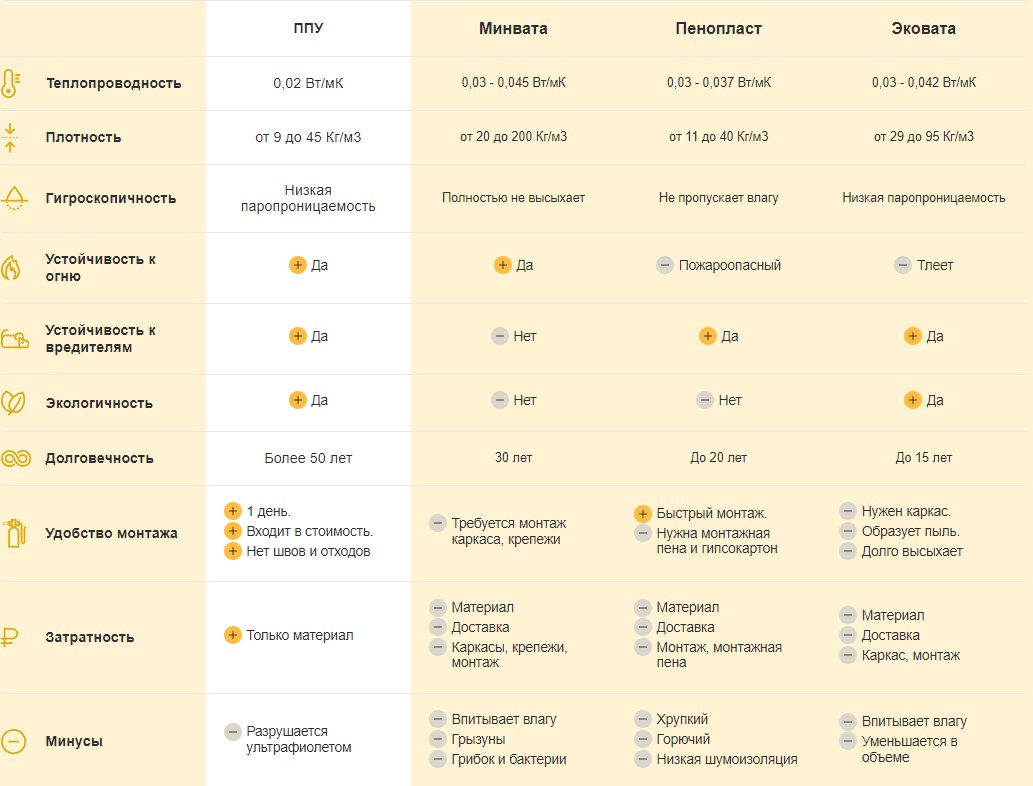 Экономия денежных средств Утепление пенополиуретаном обеспечивает снижение потерь тепла на 50%. При сегодняшних тарифах поставщиков тепла, энергии, топлива затраты на услугу окупаются не более чем за 5 лет. А только гарантийный срок службы материала превышает 30 лет. То есть обеспечивается, как минимум, 10-тикратная окупаемость!